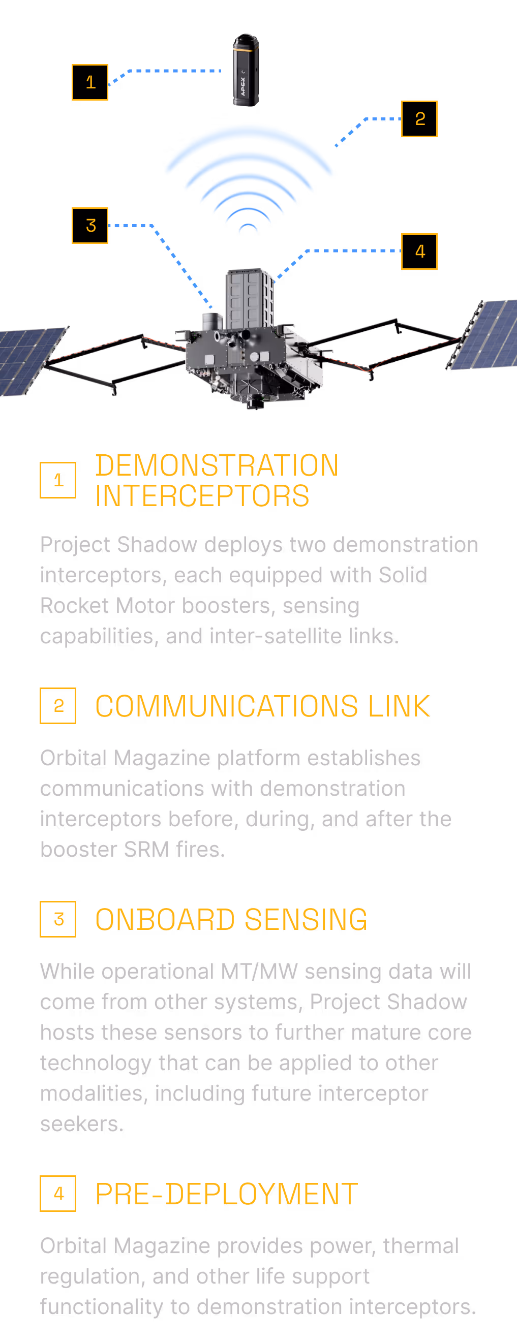 Project Shadow is an Apex-led technology maturation mission to validate the core technology behind Orbital Magazines, spacecraft designed to host and support space-based interceptors (SBIs) that protect the U.S and its allies from missile threats.